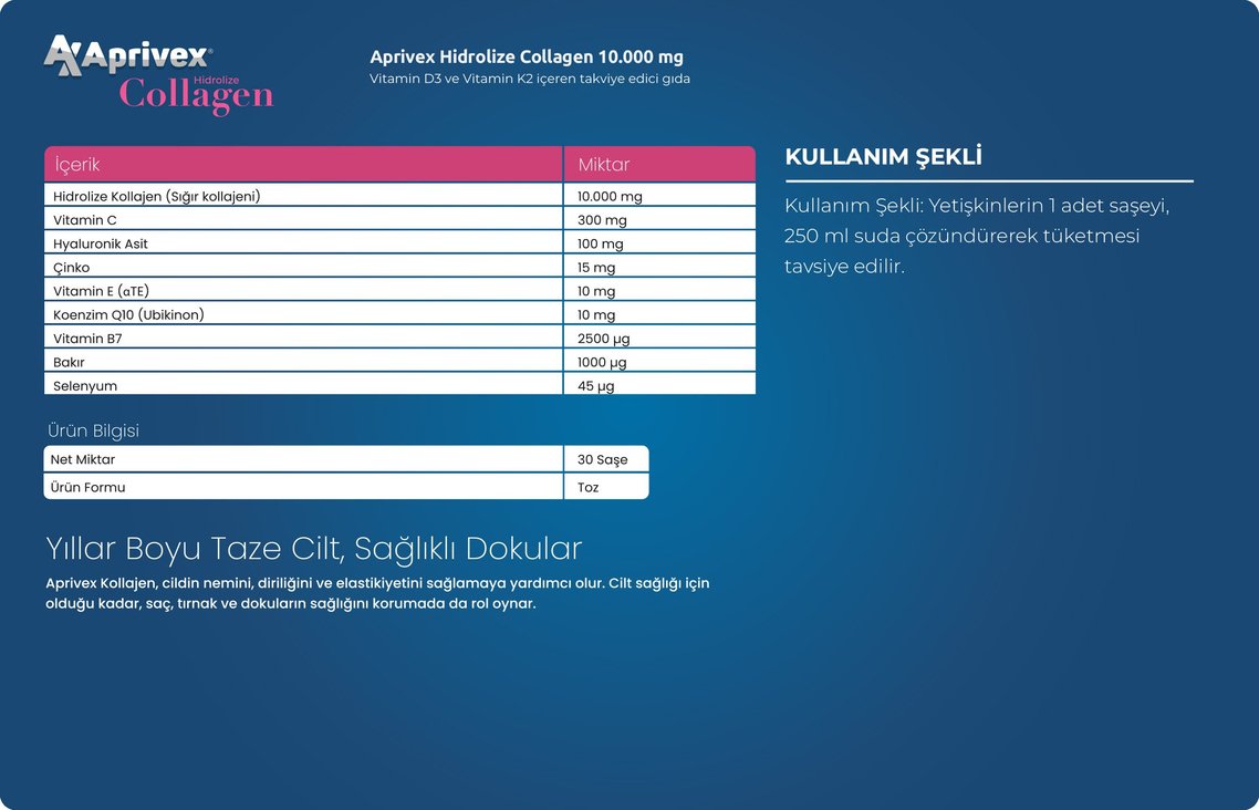 Cildin nemini, diriliğini ve elastikiyetini sağlamaya yardımcı olan Aprivex Kollajen, aynı zamanda saç, tırnak ve dokuların sağlığını korumaya yardımcı olur.